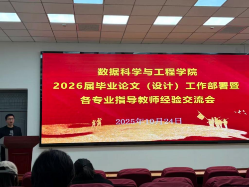 为推进2026届毕业论文(设计)工作、提升论文质量与指导实效,10月25日,数据科学与工程学院召开2026届毕业论文(设计)工作部署暨各专业指导教师经验交流会。各教研室主任及全体毕业论文(设计)指导教师参会。副院长侯致武主持会议并作工作部署。